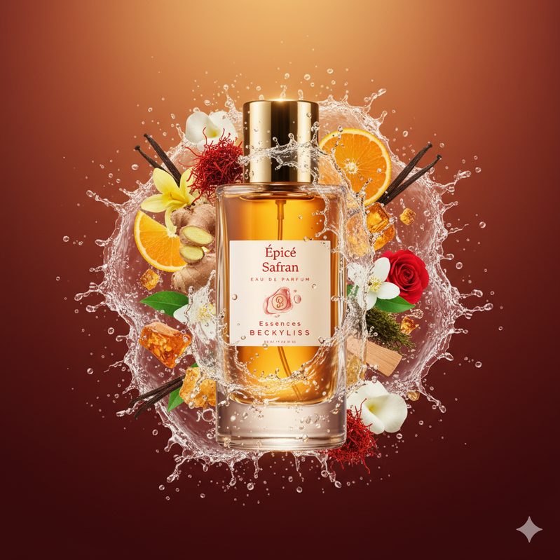 Ce parfum met en avant le safran, une épice précieuse et exotique qui apporte une chaleur orientale et un caractère envoûtant, souvent associé à des notes épicées comme la cannelle, le poivre ou le gingembre.